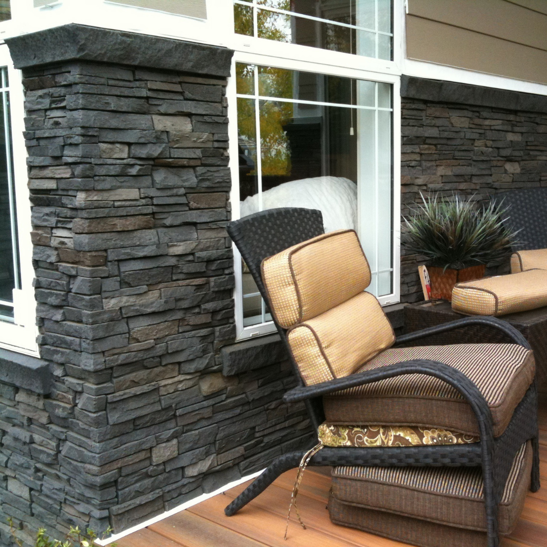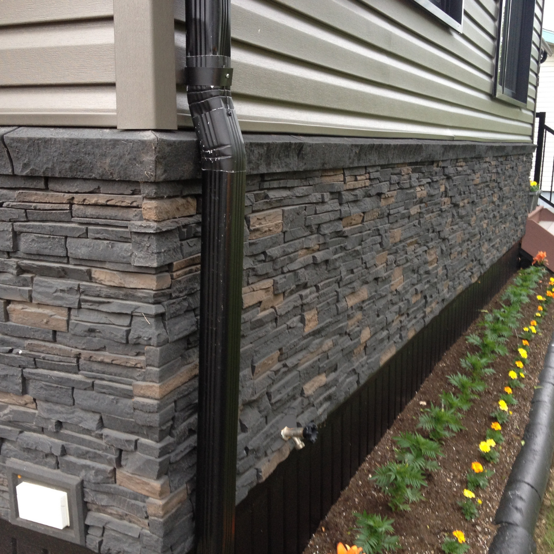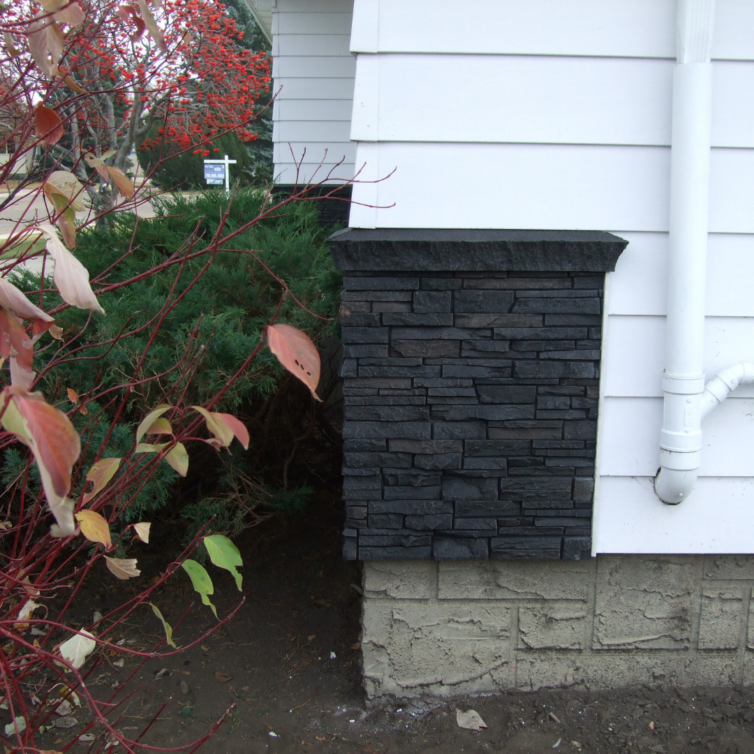 The horizontal trim for the top row of Quality Stone in Limestone. Ledge trim is used as a cap to finish off the top of the stone panels. A nice transition from stone to siding/stucco above. Ledge trim can be mitered for corners and stone finish caulking is used to hide screw heads and seal miter cuts.