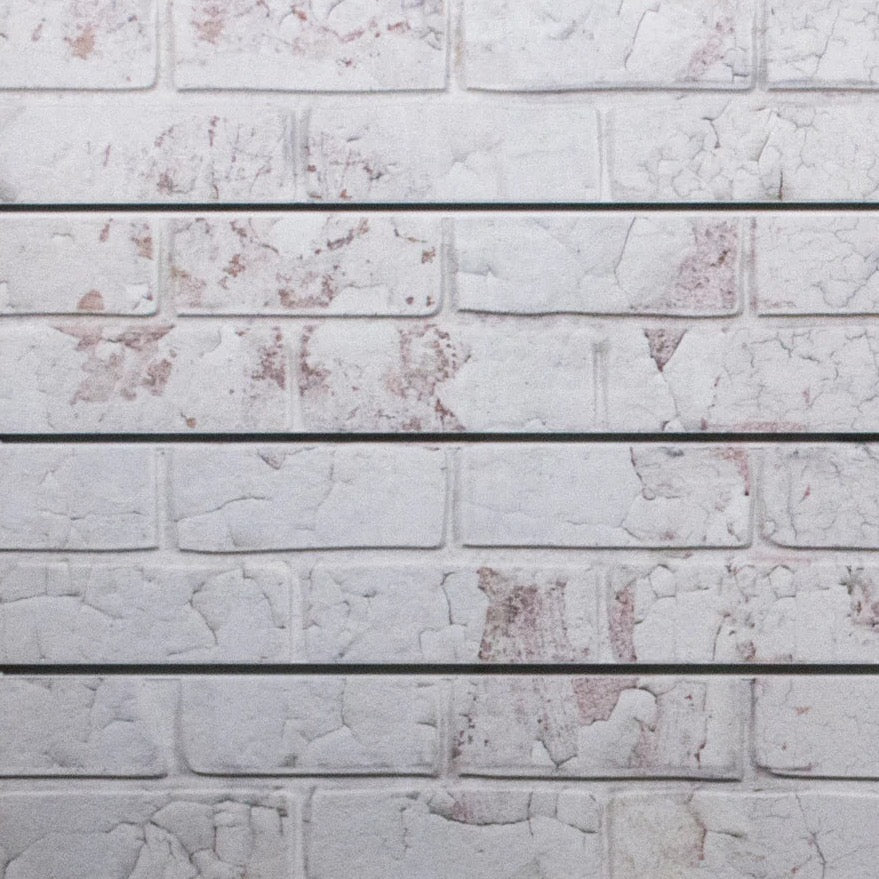 Made of MDF, these panels feature the look of old paint on bricks & are made to look like there are tiny cracks in the paint. Get the look of old, distressed brick while getting the functionality of slatwall. 3D Brick Old Paint Slatwall panels in the color white offer the look of red brick that has been painted white. Most of the brick is white with the look of distressed, red bricks peeking through at certain spots.